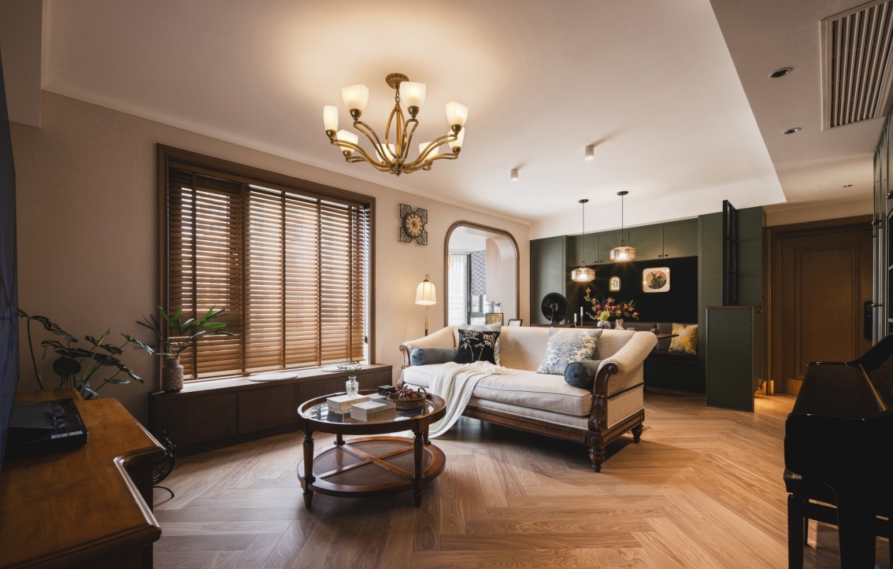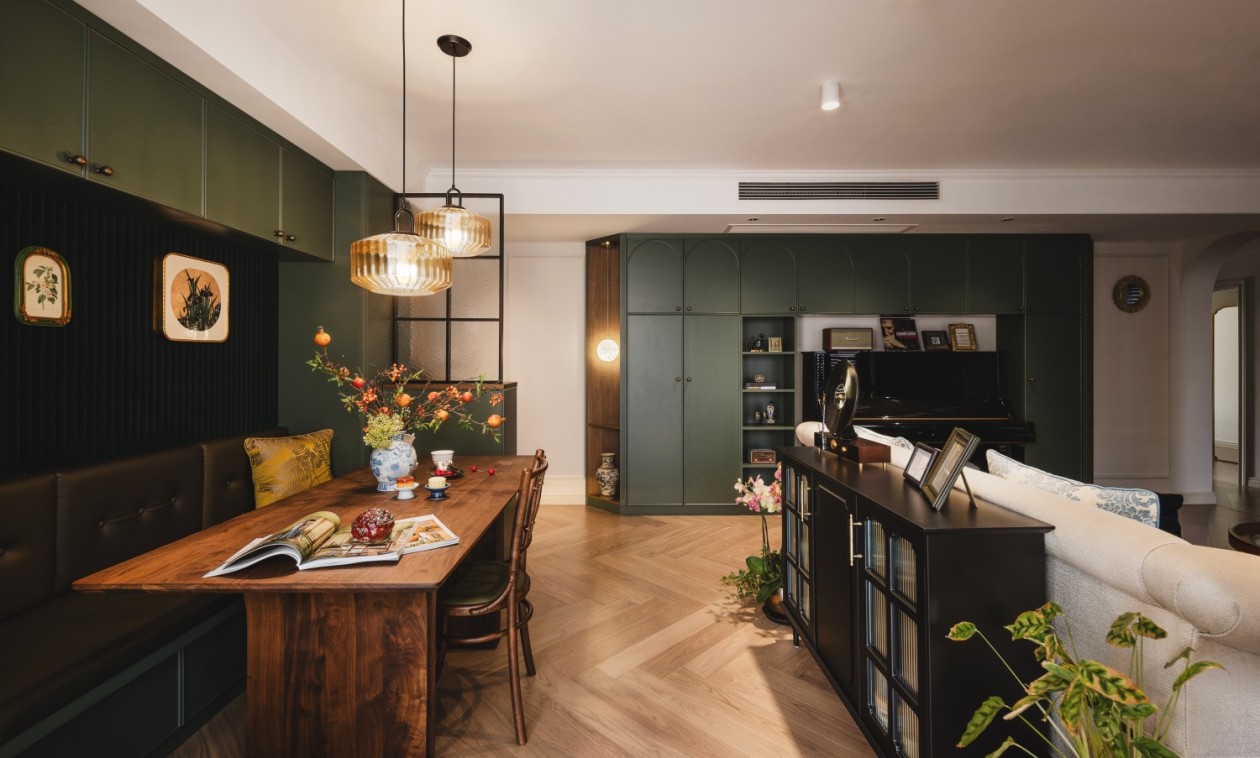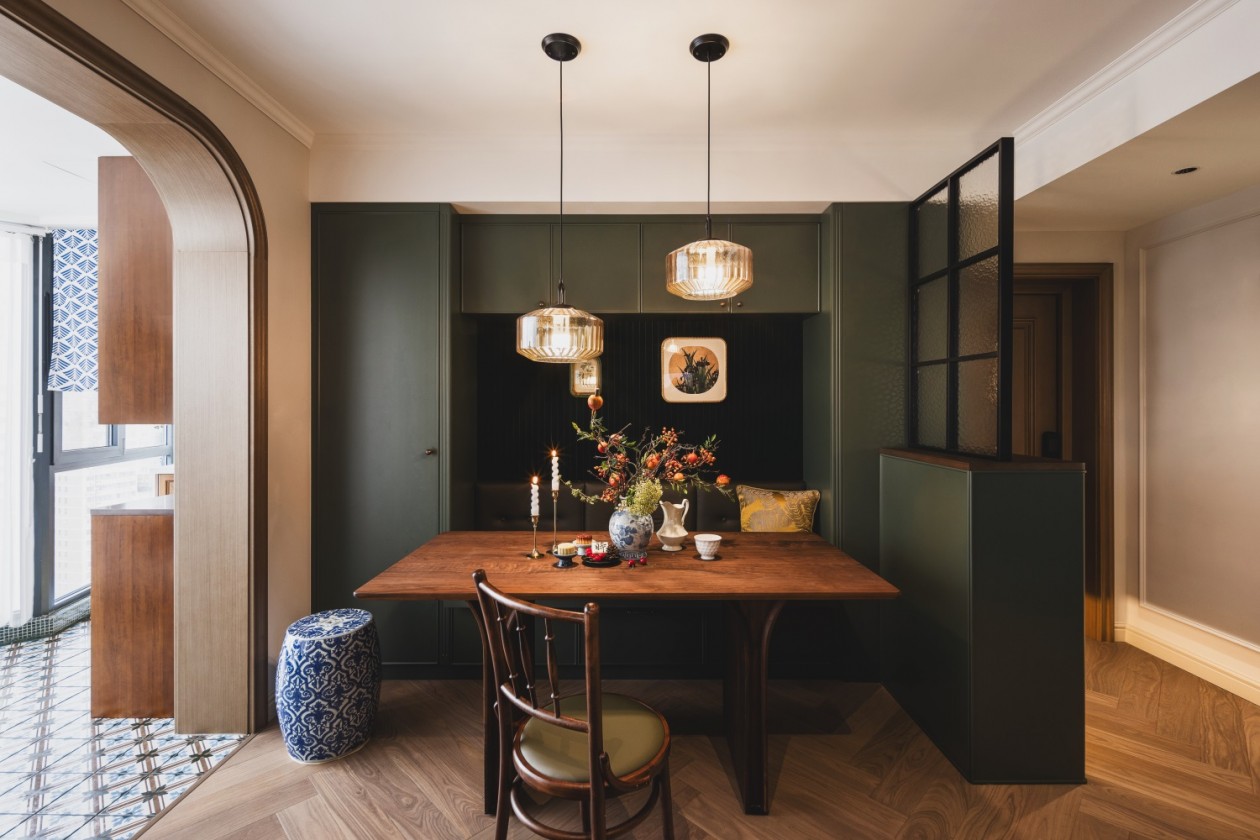 步入這個家的第一眼,便仿若走進了民國時代,宛若電影質感般的新家,隨處散發(fā)著木質氣息。老上海的海派腔調和復古南洋風情相得益彰,藝術感油然而生。