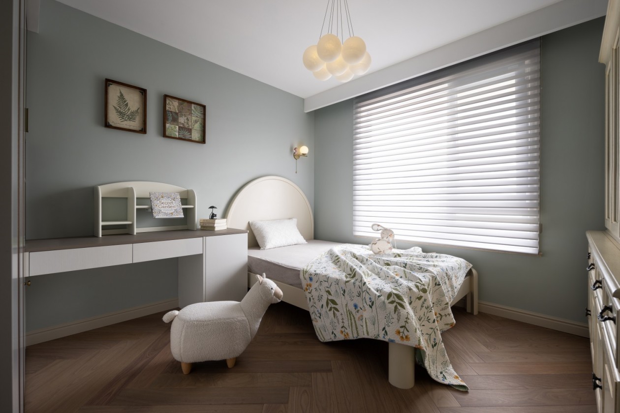 女孩房藍綠色,墻面選擇了很清新的多樂士豆蔻青,帶來平和純凈的感受。
