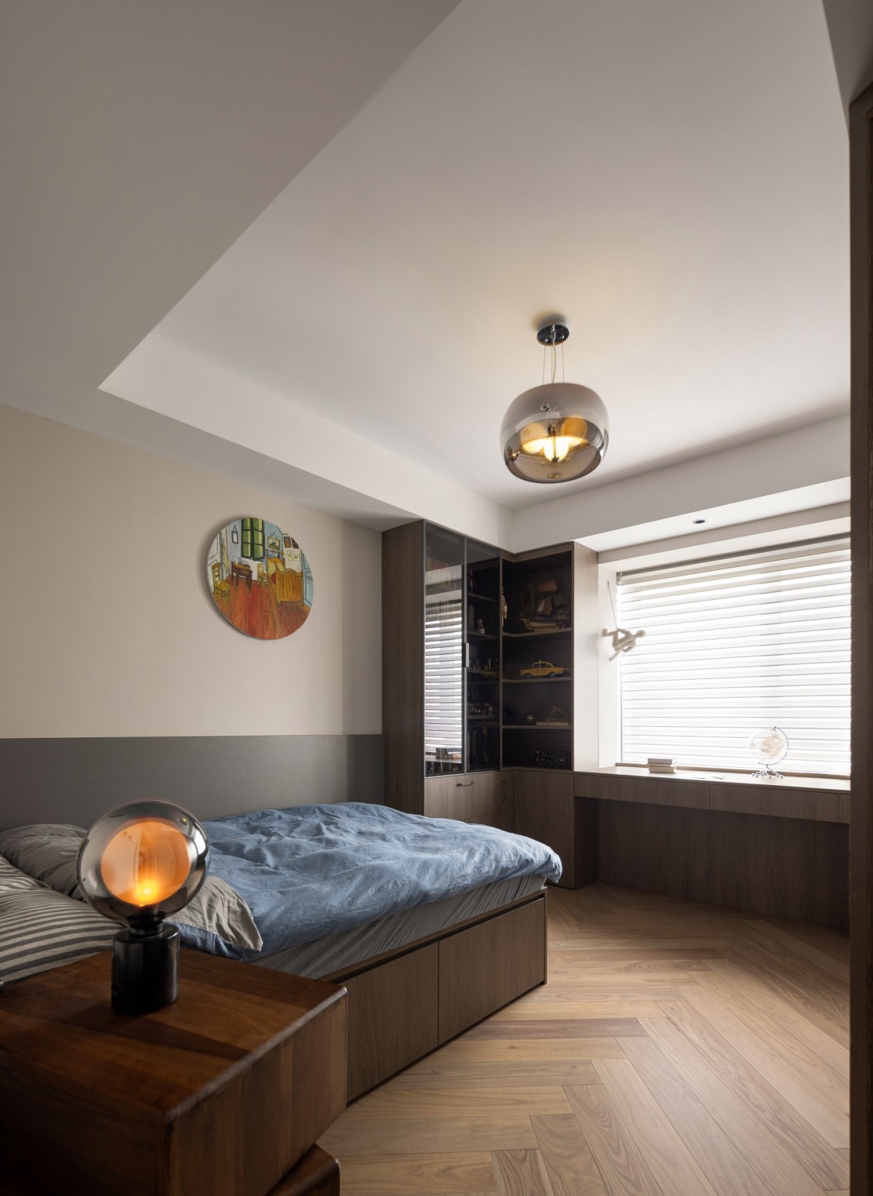 男孩房整體是灰咖色調,墻面雙色相拼,讓其產生很好的空間質感。床位于入門左邊,右邊是衣柜,搭配一個轉角定制書柜結合飄窗設計的書桌,整個空間這樣布置顯得寬敞而整潔。